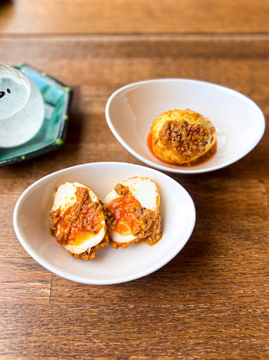 トッピングメニューのスパイス卵は、お店の隣で飼育されている鶏が産んだ新鮮な有精卵を使っています。